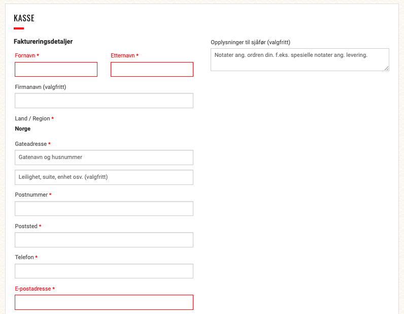 After filling out the form, scroll down past your order before proceeding to the next field. Here, you can choose whether you want to (Hentes hos Baker Hansen) pick up your order at one of our stores or (Hjemkjøring i Oslo og Bærum: kr 140) have it delivered to an address in Oslo or Bærum (shipping starts from kr 140). Note that we only offer delivery in Oslo and Bærum. For delivery in Asker, Drammen, or Strømmen, please contact our stores in those areas. We do not deliver elsewhere in the country.