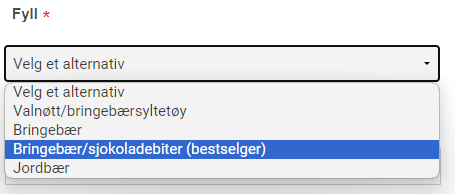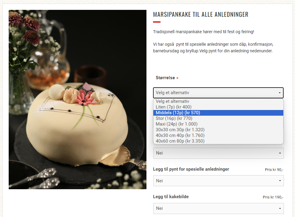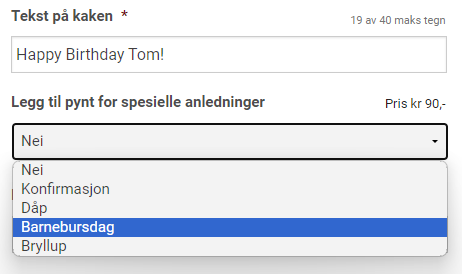 Leveringstid * / Delivery Time * – Select your desired pick up time from the dropdown menu. Choose «Før 12:00» / «Before 12:00» to pick up the cake before noon on your selected date, or select «Etter 12:00» / «After 12:00» for a later pickup.