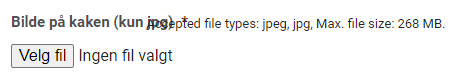 Bilde på kaken (kun jpg)* Accepted file types: jpeg, jpg, Max. file size: 268 MB. / Picture on the cake (only jpg)* Accepted file types: jpeg, jpg. Max. file size: 268 MB.