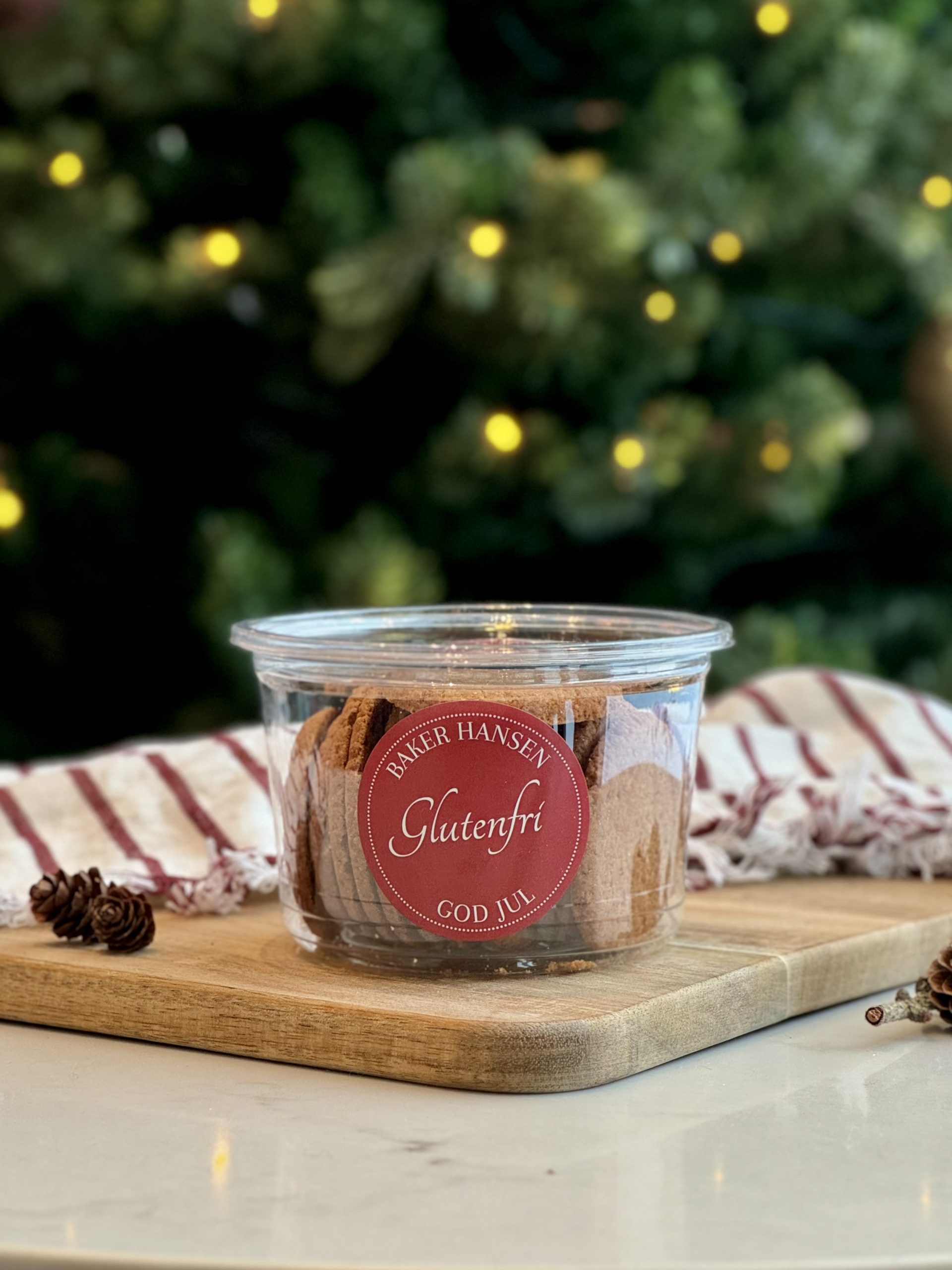 | INGREDIENSER: Glutenfritt mel (rismel, maisstivelse, potetstivelse, modifisert potetstivelse), sukker, margarin (fullherdet rapsolje, rapsolje, fullherdet kokosolje, emulgator (E471), salt, surhetsregulerende middel (E330), aroma, farge (E160a)), sirup, hevemiddel (bakepulver og natron - E450, E500, E574, E336), kanel, ingefær, nellik, pepper, fortykningsmiddel (E412, E464). |
