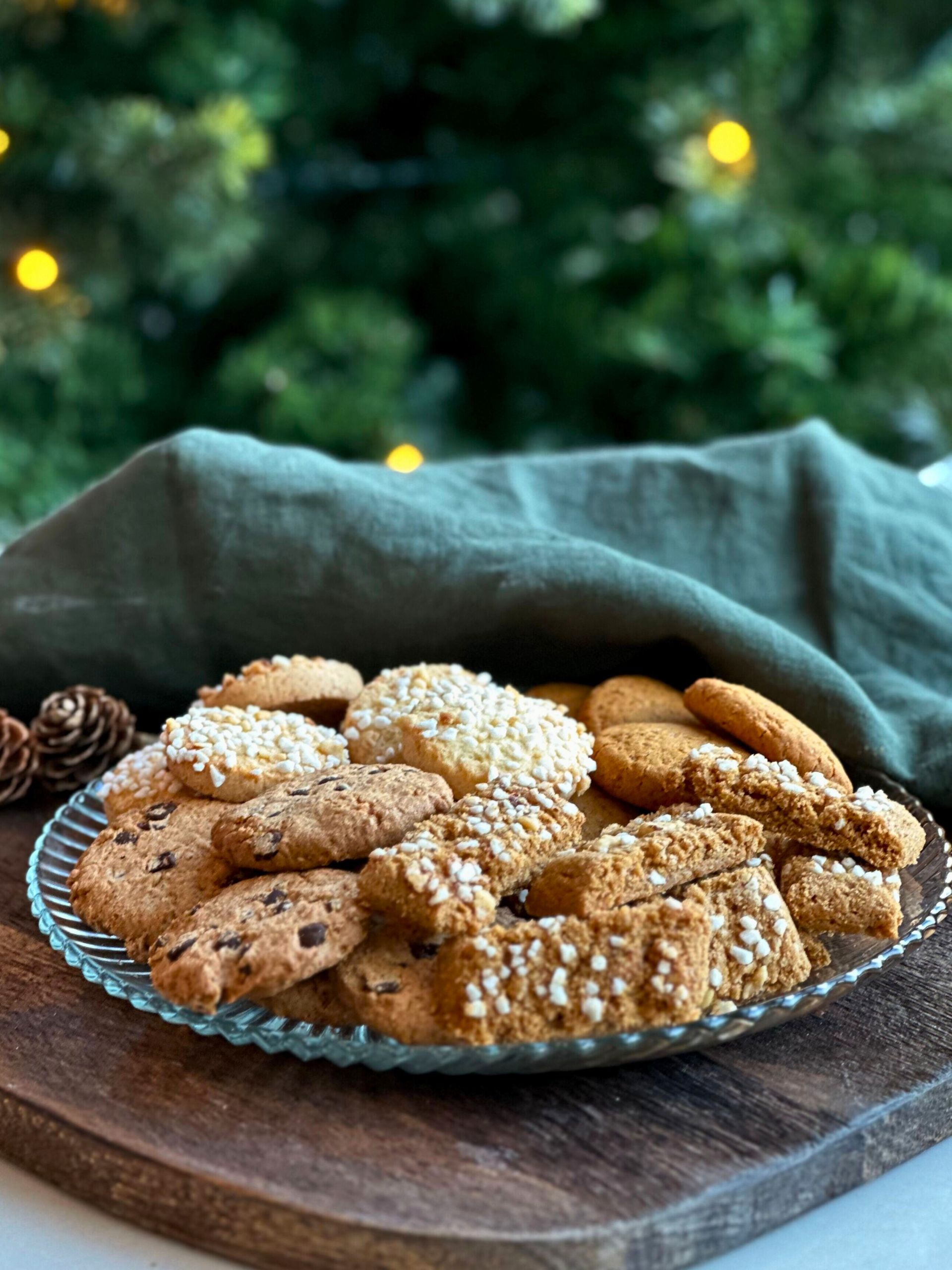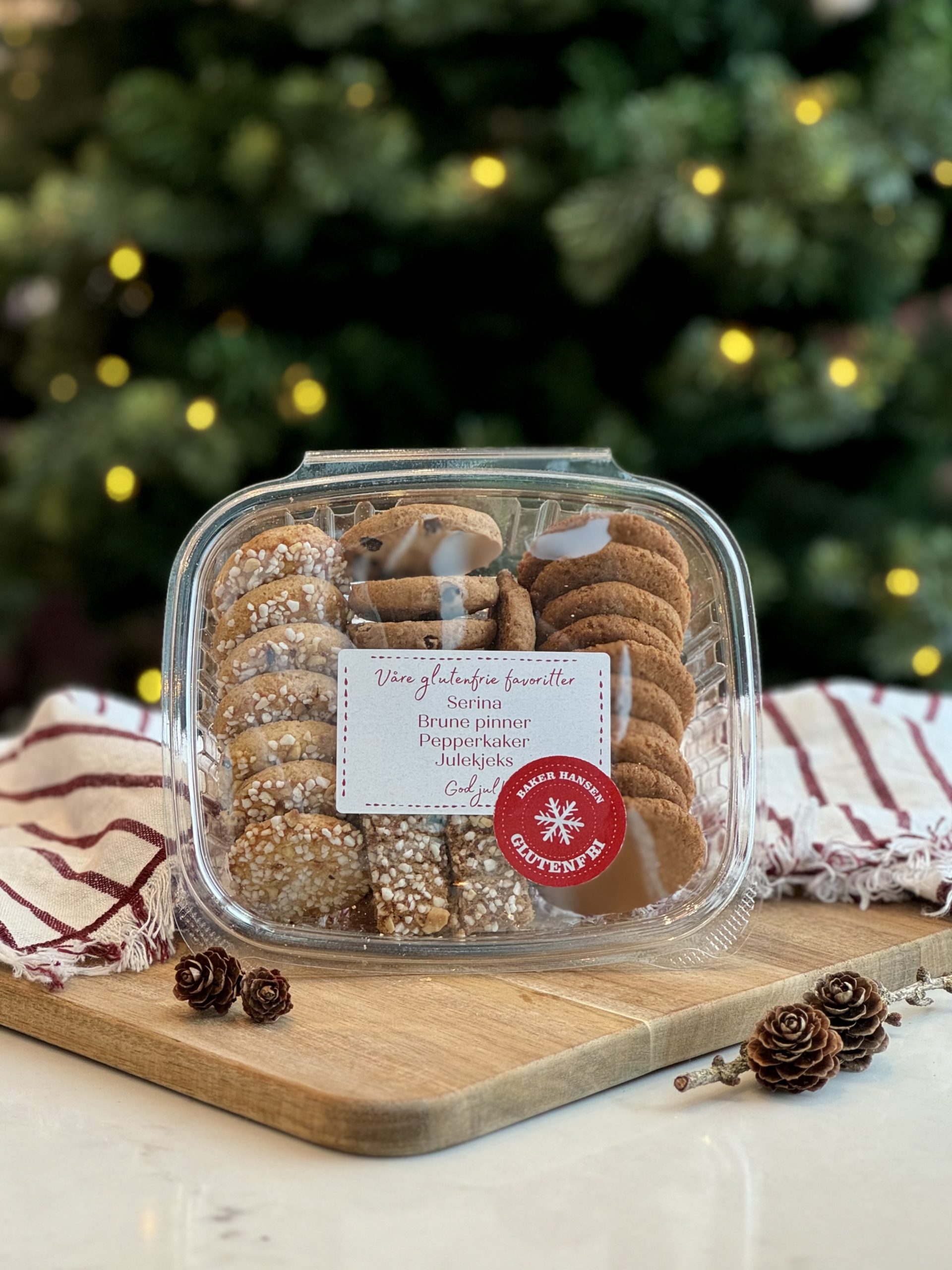 | Gluten- og melkefrie julekjeks: Gl.fritt mel (tapiokastivelse, potetstivelse, rismel, maisstivelse), sukker, mørk sjokolade (kakaomasse, sukker, emulgator (E322 (soya)), nat. vaniljearoma), margarin (fullherdet rapsolje, rapsolje, fullherdet kokosolje, emulgator (E471), salt, surhetsreg. middel (E330), aroma, farge (E160a)), havregryn, egg, havremel, hevemiddel (E574, E500), vaniljesukker (melis, potetstivelse, aroma), fiberhusk, gl.fri surdeig (ris), jodsalt, stabilisator (E412, E415, E464, E466), surhetsregulerende middel (E263). Kan inneholde spor av: nøtter |