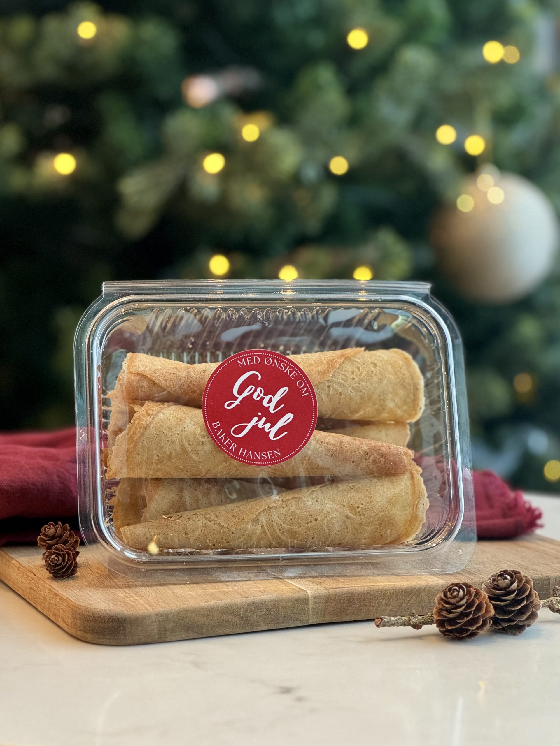 Krumkaker er en ekte klassiker i julebaksten. Disse tynne og sprø kakene har en delikat sødme og et hint av kardemomme, som gjør dem til en favoritt på kakebordet. Perfekte til servering med krem eller som en smakfull gave i julen. Hver boks inneholder 6 stykker.